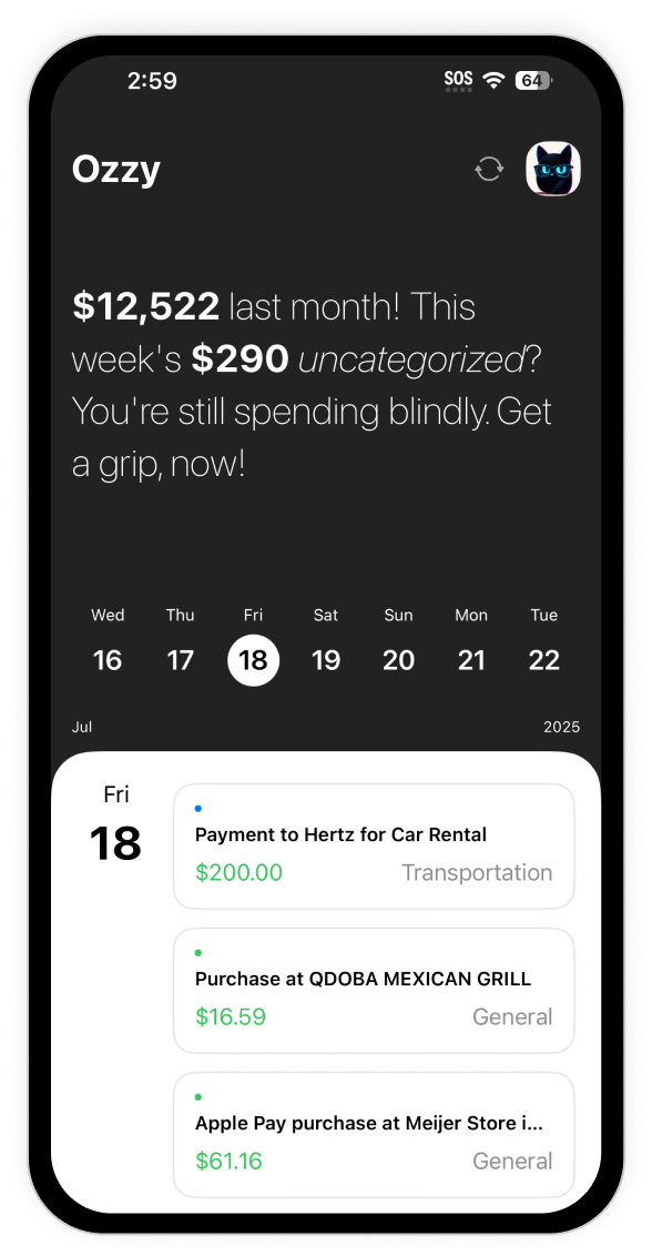 Beta - Now available for testing: Apple has officially granted Ozzy access to your Wallet. This means we can now generate smarter spending insights straight from your Apple transactions. You can take it for test drive from the Settings page of the App.